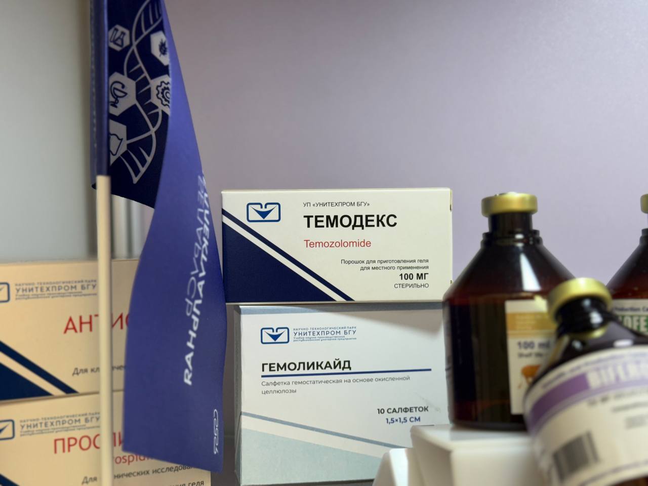 - Противоопухолевое средство «Проспиделонг» для лечения больных раком желудка с диссеминированным поражением брюшины; фармацевтические субстанции и лекарственные препараты локального противоопухолевого действия «Цисплацел» и «Теродекс» (УП «Унитехпром БГУ»).