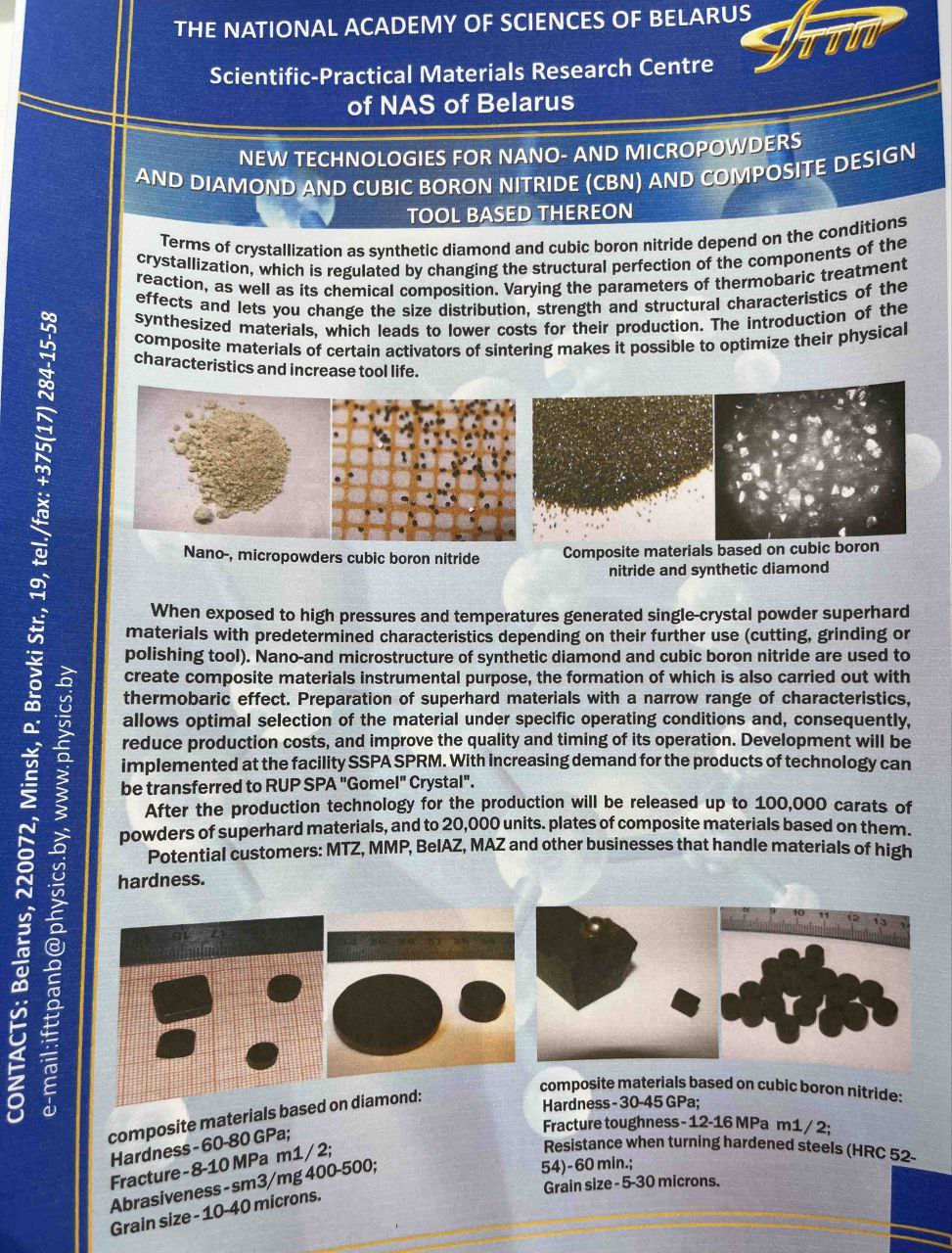 неперетачиваемые режущие пластины из композиционного материала на основе кубического нитрида бора. Отечественных аналогов нет. По сравнению с украинским аналогом (композит 10Д) разработанные пластины характеризуются повышенной на 12-17% твердостью, трещиностойкостью – на 54%, пределом прочности при сжатии – на 30-35%, модулем упругости (Юнга) на 22-23%. Производительность увеличивается на 10% за счет уменьшения времени спекания режущих пластин, энергоемкость снижается на 10%, материалоемкость – на 40% (Государственное научно-производственное объединение «Научно-практический центр Национальной академии наук Беларуси по материаловедению»);