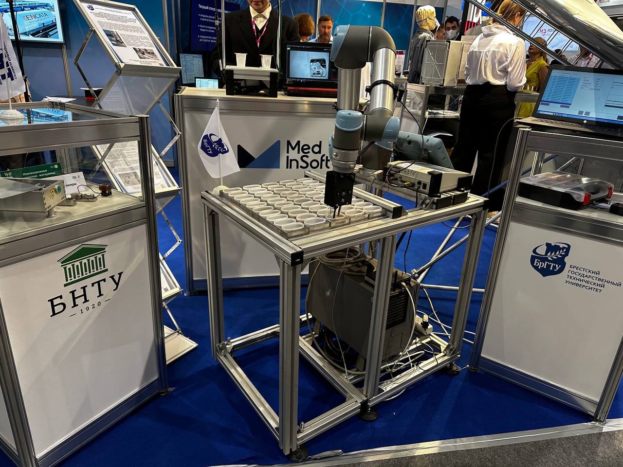 автономный мобильный коллаборативный робот-манипулятор (АМКР) с системой технического зрения, предназначенный для решения комплексных задач, в том числе: поиск и определение предметов с помощью технического зрения, взятие объектов с помощью захватного механизма, перемещение взятого объекта в пределах помещений. Перспективными приложениями для АМРК является комплексная санитарная обработка помещений дезинфицирующими средствами, комплектация заказов для ритейлеров, работа в условиях автоматизированного склада, обслуживание лабораторного оборудования медицинских центров, научные исследования в области мобильной и коллаборативной робототехники (технопарк Брестского государственного технического университета);