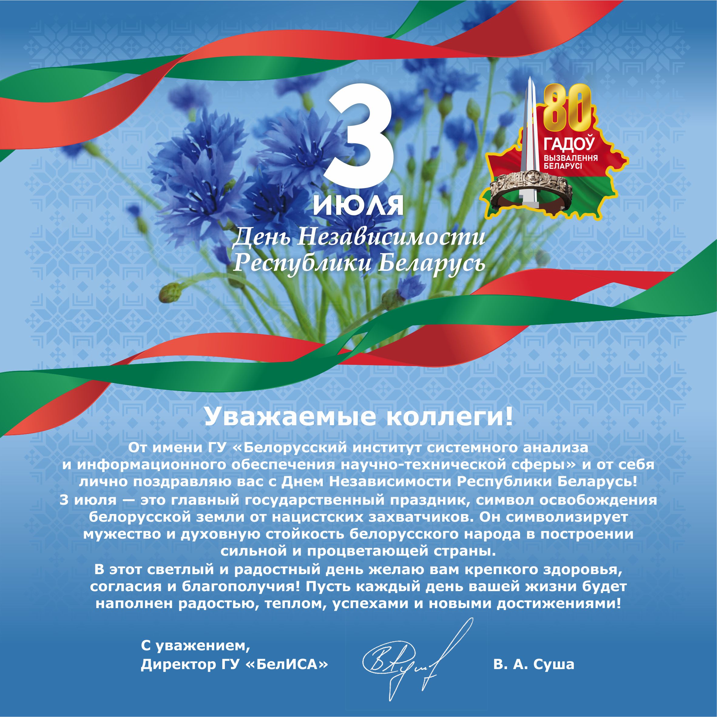 Поздравление директора ГУ «БелИСА» с Днем Независимости Республики Беларусь