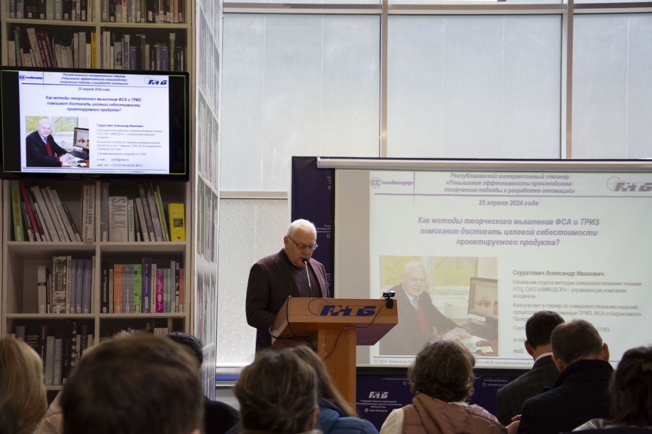 В рамках Года качества и в преддверии Международного дня интеллектуальной собственности Государственный комитет по науке и технологиям Республики Беларусь, Республиканская научно-техническая библиотека и научно-практический журнал «Наука и инновации» НАН Беларуси провели Республиканский интерактивный семинар «Повышение эффективности производства: творческие подходы к разработке инноваций» для специалистов инженерно-конструкторских служб, дизайнеров, менеджеров, маркетологов,  служб по управлению интеллектуальной собственностью предприятий и организаций, специалистов малых и средних предприятий.