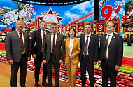 Отдавая дань уважения боевому и трудовому подвигу соотечественников в годы войны, Глава государства наградил вымпелом «3а мужнасць і стойкасць у гады Вялiкай Айчыннай вайны» девять белорусских населенных пунктов, наиболее самоотверженно проявивших себя в борьбе с врагом: Барановичи, Дзержинск, Дятлово, Калинковичи, Любань, Осиповичи, Чаусы, Оболь и Освею. Президент вручил соответствующие почетные грамоты представителям руководства этих населенных пунктов. Президент отметил, что награждения вымпелом достойны все города и села страны. И поэтому отобрать лучших, особенных было очень сложно. «Ведь в каждом населенном пункте, на каждом клочке белорусской земли фашисты сталкивались с ожесточенным сопротивлением. Везде земля просто пылала под сапогом оккупантов», – сказал Глава государства.
