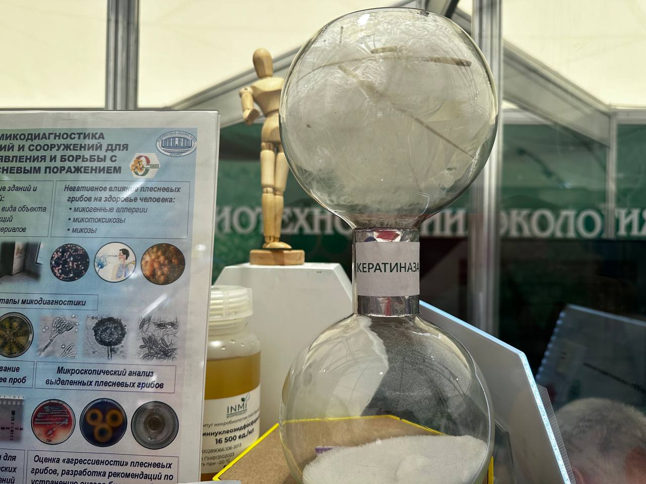 бактериальная кератиназа для применения в косметологии. Кератиназа – специфический вид протеолитических ферментов для гидролиза нерастворимого кератина. Кератиназа действует селективно, расщепляет труднорастворимые склеропротеины ороговевшего эпителия кожи, оказывая мягкий эксфолиирующий эффект, ослабляет сцепление корнеоцитов, обеспечивая трансэпидермальную доставку активных компонентов в глубокие слои кожи (ГНУ «Институт микробиологии Национальной академии наук Беларуси»);