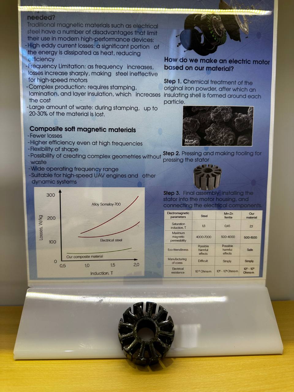 Новый магнитный материал может заменить ламинированную электромагнитную сталь для высокочастотных применений, в таких изделиях как трансформаторы дроссели, современные вентильные высокооборотные электродвигатели и генераторы. Основное преимущество нового материала перед электромагнитной сталью состоит в отсутствии потерь на вихревые токи на высоких частотах за счет электрической изоляции отдельных частиц железа в композитном материале.