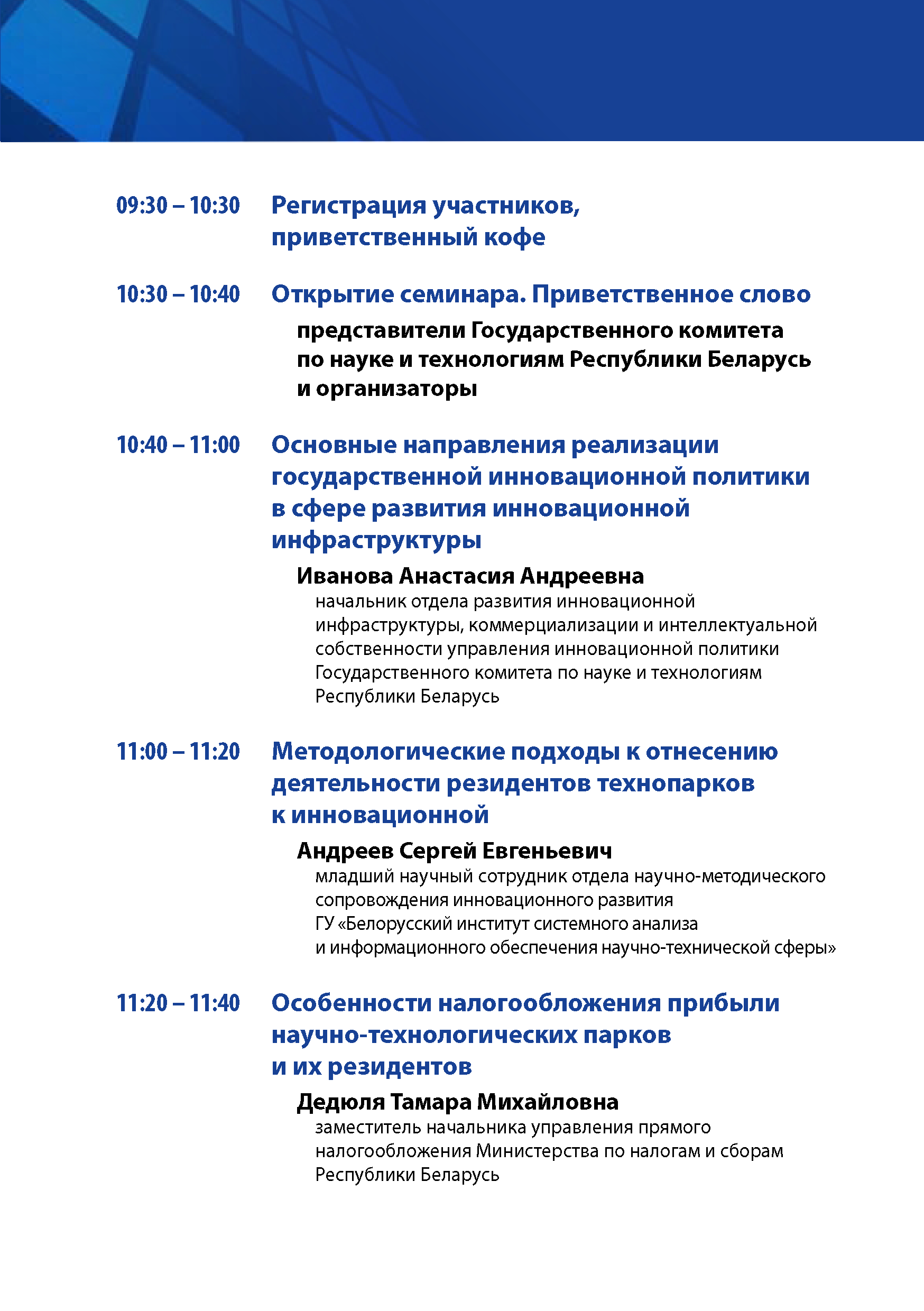 В ходе семинара планируется рассмотреть вопросы методологических и организационных особенностей учета и налогового регулирования инновационной деятельности, информационного обеспечения деятельности субъектов инновационной инфраструктуры и др.